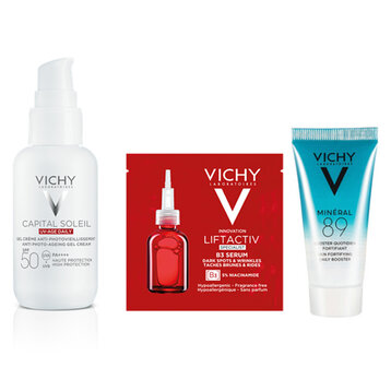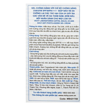 Gel chống nắng bảo vệ da và ngăn ngừa thâm nám, đốm nâu, nếp nhăn Vichy UV Age daily 50ml SPF 50 và PA++++ kết hợp tối ưu công nghệ chống nắng độc đáo INUTEC giúp chống tia cực tím tối đa cùng hoạt chất da liễu [5% Niacinamide + Probiotic Fraction + Peptide] giúp cải thiện và ngăn ngừa lão hóa, thâm nám đốm nâu. Kết cấu sản phẩm lỏng nhẹ như nước, thấm nhanh, không gây nhờn rít da.
