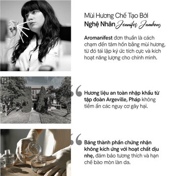 Mùi hương được chế tạo bởi nghệ nhân nước hoa Jennifer Jambonz. Nước hoa Aromanifest đơn thuần là cách chạm đến tâm hồn bằng mùi hương, từ đó tái lập ký ức tích cực và kích hoạt năng lượng cho chính mình.