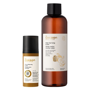 Thành phần sản phẩm 1. Kem Chống Nắng Cocoon Bí Đao Quang Phổ Rộng 50ml Thành phần chính:  Chiết xuất bí đao: có tác dụng giảm viêm, kháng khuẩn, làm dịu, giúp giảm mụn viêm. Vitamin B3 (Niacinamide): tăng cường hàng rào bảo vệ da ngăn lại các tác động xấu từ môi trường như ô nhiễm, khói bụi, góp phần tổng hợp ceramide của lớp sừng và hyaluronic acid tự nhiên. Vitamin E (Tocopherol): là một chất chống oxi hoá mạnh được chiết xuất hoàn toàn từ đậu nành không biến đổi gen (Non-GMO). Hydroxymethoxyphenyl Decanone: là một chất chống oxi hoá bảo vệ tế bào, giảm tình trạng kích ứng, bảo vệ da khỏi những tổn thương.  Tetrahexyldecyl Ascorbate: là một dẫn xuất vitamin C chống oxi hoá mạnh, bảo vệ tế bào trước bức xạ UV và ngăn ngừa sự hình thành sắc tố do UV gây ra. Tinosorb A2B (Tris-Biphenyl Triazine): là màng lọc thế hệ mới bảo vệ hiệu quả nhất trong quãng UVB-UVA2 với đỉnh hấp thụ là 310nm, đồng thời giúp tăng cường cho quãng UVA1. Tinosorb S (Bis-Ethylhexyloxyphenol Methoxyphenyl Triazine): màng lọc phổ rộng thế hệ mới với phổ bảo vệ rất dài bao phủ từ UVB, UVA2 cho đến UVA1 với 2 đỉnh chống UV 310nm và 345nm.  Uvinul T150 (Ethylhexyl Triazone): màng lọc thế hệ mới mang lại khả năng hấp thụ ổn định UVB cao nhất trong số tất cả các bộ lọc UVB trên thị trường hiện nay. Uvinul A Plus (Diethylamino Hydroxybenzoyl Hexyl Benzoate): là màng lọc thế hệ mới chống UVA2-UVA1 rất mạnh với đỉnh bảo vệ lên đến 354nm, cùng khả năng bảo vệ tuyệt vời ngăn lại các gốc tự do. Parsol 1789 (Avobenzone - Butyl Methoxydibenzoylmethane): được xem là màng lọc chống UVA mạnh nhất hiện nay và cũng là màng lọc duy nhất được thông qua trên toàn cầu với quãng hấp thụ rộng và đỉnh hấp thụ rất cao 357 nm. Thành phần đầy đủ:  Aqua-Water, C12-15 Alkyl Benzoate, Isododecane, Cyclopentasiloxane, BisEthylhexyloxyphenol Methoxyphenyl Triazine, Butyloctyl Salicylate, TrisBiphenyl Triazine, Silica, Methyl Methacrylate Crosspolymer, Dicaprylyl Carbonate, Ethylhexyl Triazone, Butyl Methoxydibenzoylmethane, Diethylamino Hydroxybenzoyl Hexyl Benzoate, Ethylhexyl Methoxycrylene, Caprylyl Methicone, Benincasa Cerifera Fruit Extract, Niacinamide, Betaine, Hydroxymethoxyphenyl Decanone, Tetrahexyldecyl Ascorbate, Glycine Soja (Soybean) Seed Extract , Acrylates/C10-30 Alkyl Acrylate Crosspolymer, Trimethylsiloxysilicate, Glycerin, Propanediol, Butylene Glycol, Pentylene Glycol, 1, 2-Hexanediol, Trisodium Ethylenediamine Disuccinate , Tocopherol, Decyl Glucoside, Ethylhexylglycerin, Caprylic/Capric Triglyceride, Disodium Phosphate, Xanthan Gum, Phenoxyethanol. 2. Nước Tẩy Trang Bí Đao Cocoon Làm Sạch & Giảm Dầu Thành phần chính: Bí đao: làm mát, làm giảm nhiệt, kháng viêm và diệt khuẩn giúp giảm tình trạng mụn trứng cá, mụn viêm. Rau má: tăng sinh collagen cho làn da, kháng viêm, làm dịu các vết đỏ và giảm kích ứng. Tràm trà: giảm mụn trứng cá, vết thương, côn trùng cắn. Betaine: có tác dụng bảo vệ tế bào da khỏi căng thẳng từ môi trường bên ngoài như bức xạ UV, ô nhiễm môi trường và tăng khả năng giữ ẩm cho da dưới tác động của nhiệt độ và khói bụi. o-cymen-5-ol và cetylpyridinium chloride có khả năng kháng khuẩn và diệt khuẩn gây mụn. Thành phần đầy đủ: Aqua-Water, Polyglyceryl-4 Laurate/Sebacate, Polyglyceryl-4 Caprylate/Caprate, Betaine, Benincasa Cerifera Fruit Extract, Centella Asiatica Extract, O-Cymen-5-Ol, Propanediol, Glycereth-26, Glycerin, Trisodium Ethylenediamine Disuccinate , Sodium Lactate, Cetylpyridinium Chloride, Melaleuca Alternifolia Leaf Oil, Lactic Acid