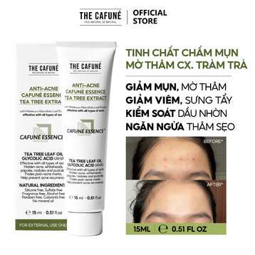 Gel Chấm Mụn The Cafuné Anti-Acne Essence Tea Tree Extract Giảm Sưng Đỏ Và Thâm Sẹo Mụn 15ml là sản phẩm hỗ trợ trị mụn đến từ thương hiệu The Cafuné - Việt Nam. Sản phẩm được chiết xuất từ các thành phần tự nhiên như tràm trà, cam thảo.