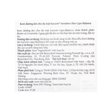 Kem dưỡng ẩm Eucerin UltraSensitive Lipo Balance Cream với thành phần Biotin và Ceramide-3 giúp phục hồi khả năng cân bằng độ ẩm của lớp lipid biểu bì. Ngăn ngừa tình trạng mất nước, cho bạn làn da mịn màng, khỏe khoắn, đầy tự tin.