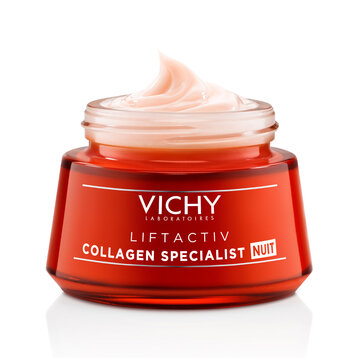 Kem Dưỡng Vichy Liftactiv Collagen Specialist Night là kem dưỡng ban đêm thuộc bộ sản phẩm Liftactiv Collagen Specialist ngăn ngừa lão hóa da mới từ thương hiệu dược mỹ phẩm Vichy. Công thức chuyên biệt chứa phức hợp Bio-Peptide, Resveratrol nguồn gốc tự nhiên và nước khoáng núi lửa Vichy giúp làm sáng da, mờ thâm nám rõ rệt, mang lại làn da đều màu, săn chắc và rạng rỡ hơn, nếp nhăn được giảm thiểu đáng kể.