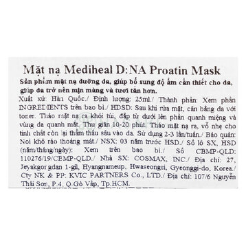Mặt nạ Mediheal D:NA Proatin Mask với thành phần chính là Sodium Hyaluronate, Sodium PCA, chất khóa ẩm Aqua Sea, DNA,... giúp mang lại các công dụng tuyệt vời cho làn da: