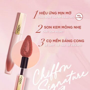 Son Mịn Lì Cao Cấp L’Oréal Paris Chiffon Signature Matte Liquid Lipstick là bộ sưu tập son tint mới từ thương hiệu L’Oréal Paris, với kết cấu son mỏng nhẹ như không, cho bạn cảm giác đôi môi mềm mại, mịn màng như nhung trong suốt thời gian sử dụng. Ngoài ra, sản phẩm còn lên màu cực chuẩn ngay từ lần quẹt đầu tiên và giữ màu lâu đến 8h, giúp đôi môi luôn căng mọng, quyến rũ, cho phái đẹp luôn tự tin, nổi bật mọi lúc mọi nơi.