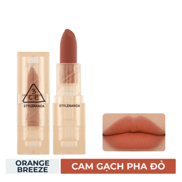 Son Thỏi 3CE Soft Matte Lipstick (Warm&Cool Edition) Vỏ Trong Màu Lì Orange Breeze - Cam Gạch Pha Đỏ 3.5g là 1 trong 6 màu son thuộc bộ sưu tập son thỏi lì vỏ trong phiên bản đặc biệt của thương hiệu 3CE - Hàn Quốc. Sản phẩm được lấy cảm hứng từ nhiệt độ màu sắc để cho ra đời 6 màu son thuộc 2 tone da khác nhau: Lạnh – Ấm. Son nổi bật với những đặc tính lướt mềm mại, nhẹ môi, tạo hiệu ứng mịn lì tự nhiên, không bị khô hay bị bột và cho hiệu quả lâu trôi suốt cả ngày dài.