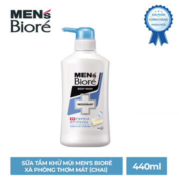 Sữa tắm khử mùi Men's Bioré xà phòng thơm mát 440ml là giải pháp hữu hiệu dành cho nam giới muốn loại bỏ bụi bẩn sâu trong lỗ chân lông, đồng thời giúp ngăn ngừa vi khuẩn gây mụn trên da. Không chỉ vậy sản phẩm còn với hương thơm tươi mát sẽ giúp đánh bay mùi cơ thể, tăng thêm sức cuốn hút cho cánh mày râu.