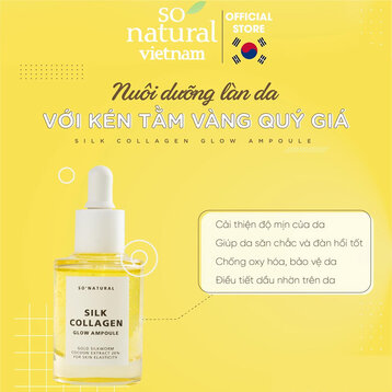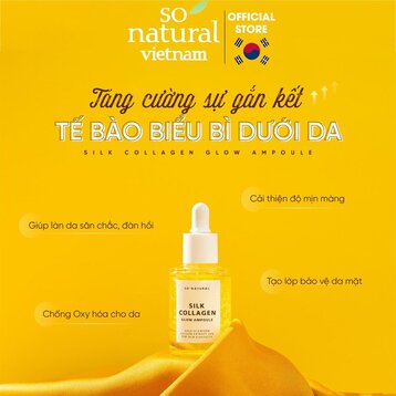 Tinh Chất So'Natural Dưỡng Da Căng Bóng & Ngừa Lão Hoá Silk Collagen Glow Ampoule 30ml là tinh chất đến từ thương hiệu mỹ phẩm So’Natural của Hàn Quốc, chiết xuất 20% kén tằm vàng và collagen thúc đẩy tái tạo da, cải thiện làn da thiếu sức sống, khô ráp, hỗ trợ ngăn ngừa nếp nhăn, bổ sung collagen giúp da căng mướt, đàn hồi.