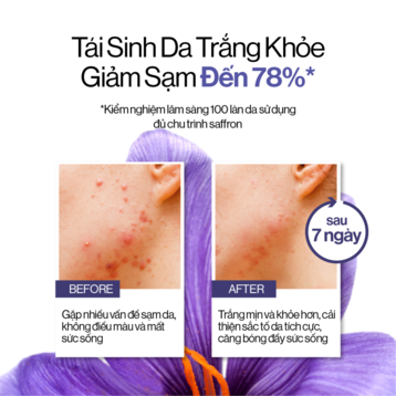 Chứa Retinol tự nhiên từ chiết xuất saffron giúp tái tạo và loại bỏ sắc tố từ đó dưỡng da sáng khoẻ đồng thời cải thiện sạm da trong 7 ngày.