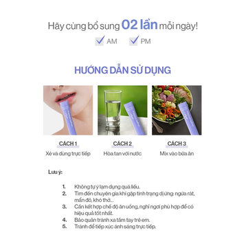 Sử dụng mỗi ngày từ 1-2 gói để bổ sung collagen và một số vitamin cho cơ thể.