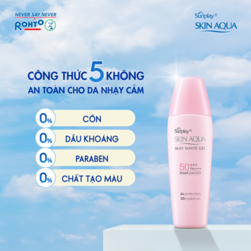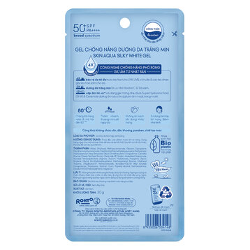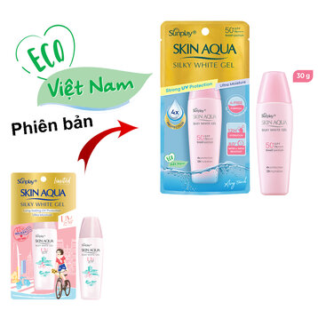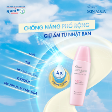 Gel Chống Nắng Sunplay Skin Aqua Silky White Gel SPF50+ PA++++ là dòng sản phẩm chống nắng dành cho da mặt và toàn thân đến từ thương hiệu chống nắng Sunplay Skin Aqua. Phiên bản mới năm 2021 được cải tiến với công nghệ CHỐNG NẮNG - GIỮ ẨM đột phá từ Nhật Bản giúp chống nắng mạnh mẽ và bền bì trên da, đồng thời ngăn ngừa mất nước và duy trì độ ẩm tối ưu. Bên cạnh đó, công thức được bổ sung Super Hyaluronic Acid giúp tăng cường độ ẩm và Vitamin C, Trà Xanh giúp chống oxy hóa, dưỡng da sáng mịn. Sản phẩm lý tưởng dành cho làn da khô thiếu ẩm.