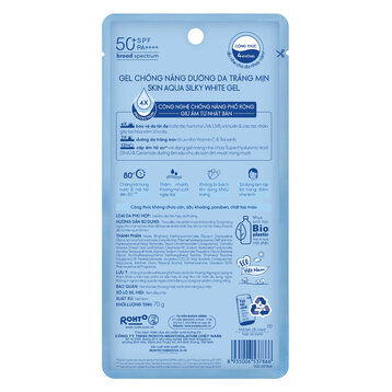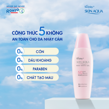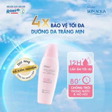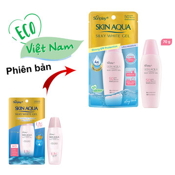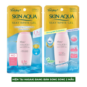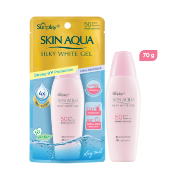 Gel Chống Nắng Sunplay Skin Aqua Silky White Gel SPF50+ PA++++ là dòng sản phẩm chống nắng dành cho da mặt và toàn thân đến từ thương hiệu chống nắng Sunplay Skin Aqua. Phiên bản mới năm 2021 được cải tiến với công nghệ CHỐNG NẮNG - GIỮ ẨM đột phá từ Nhật Bản giúp chống nắng mạnh mẽ và bền bì trên da, đồng thời ngăn ngừa mất nước và duy trì độ ẩm tối ưu. Bên cạnh đó, công thức được bổ sung Super Hyaluronic Acid giúp tăng cường độ ẩm và Vitamin C, Trà Xanh giúp chống oxy hóa, dưỡng da sáng mịn. Sản phẩm lý tưởng dành cho làn da khô thiếu ẩm.