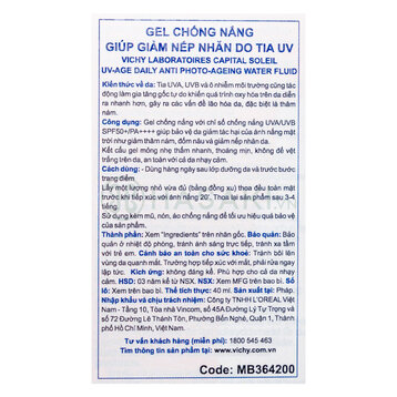 Gel Chống Nắng Vichy Capital Soleil UV Age Daily SPF 50 Bảo Vệ Da, Ngừa Thâm Nám 40ml (Mới) là sản phẩm chống nắng da mặt đến từ thương hiệu Vichy - Pháp. Nhờ màng lọc quang phổ rộng Vichy Capital Soleil UV Age Daily SPF 50 giúp bảo vệ da tối ưu cùng khả năng làm dịu da khỏi sự “bỏng rát” của cái nắng nhờ có thành phần nước khoáng Vichy giàu khoáng chất.
