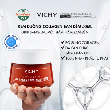 Kem Dưỡng Vichy Liftactiv Collagen Specialist Night là kem dưỡng ban đêm thuộc bộ sản phẩm Liftactiv Collagen Specialist ngăn ngừa lão hóa da mới từ thương hiệu dược mỹ phẩm Vichy. Công thức chuyên biệt chứa phức hợp Bio-Peptide, Resveratrol nguồn gốc tự nhiên và nước khoáng núi lửa Vichy giúp làm sáng da, mờ thâm nám rõ rệt, mang lại làn da đều màu, săn chắc và rạng rỡ hơn, nếp nhăn được giảm thiểu đáng kể.