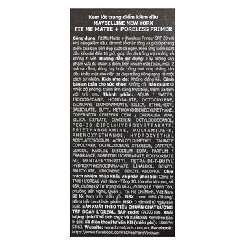 Kem lót Fit Me Primer Matte+Poreless SPF 20 đến từ thương hiệu Maybelline New York có thành phần tích hợp đất sét khoáng giúp kiềm dầu, ngăn nền xuống tông hiệu quả suốt 16H. Chất kem dạng sữa dễ tán, đem lại hiệu ứng làm mềm da, làm mờ lỗ chân lông ngay sau khi sử dụng. Ngoài ra, sản phẩm có thêm SPF 20 giúp bảo vệ da khỏi tác hại của ánh nắng mặt trời. Sản phẩm được khuyên dùng trước bước đánh kem nền để đem lại lớp nền mịn lì, không bóng dầu, không xuống tông suốt ngày dài.