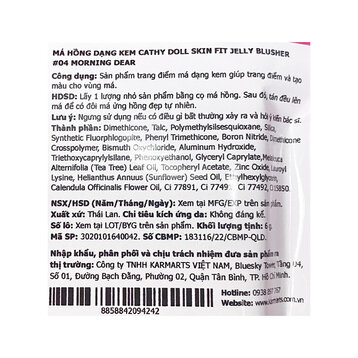Cathy Doll Skin Fit Jelly Blusher là dòng sản phẩm phấn má hồng dạng kem đến từ thương hiệu mỹ phẩm Cathy Doll Thái Lan, với kết cấu mềm mịn, mỏng nhẹ dễ tán, không vón cục và bết dính. Màu lên mượt mà chuẩn sắc, bám dính lâu trôi, tạo hiệu ứng đôi má ửng hồng tự nhiên cả ngày. Công thức chứa các thành phần thiên nhiên dưỡng da chắc khỏe, không gây kích ứng.