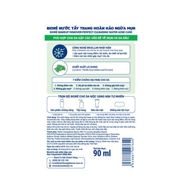 • Nước Tẩy Trang Hoàn Hảo Ngừa Mụn Bioré với chiết xuất lá Shiso giúp kháng viêm, ngừa mụn sẽ là lựa chọn lý tưởng cho các nàng da nhờn và da dễ lên mụn.