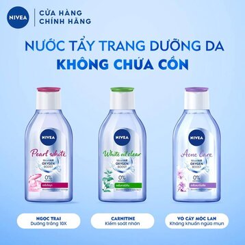 Thành phần sản phẩm 1. Nước Tẩy Trang NIVEA Kiểm Soát Nhờn Bright Oil Clear Micellar Water Thành phần chính: Chiết xuất trái cherry anh đào: là chất giàu vitamin C giúp dưỡng sáng da. Glycerin: giữ da mềm mịn. Carnitine: là chất giúp giảm tiết nhờn - một trong những nguyên nhân chính gây mụn. 2. Nước Tẩy Trang NIVEA Làm Sáng Da Pearl White Micellar Water Thành phần chính: Chiết xuất trái cherry anh đào: là chất giàu vitamin C giúp dưỡng sáng da. Glycerin: giữ da mềm mịn. Thành phần chi tiết: Aqua, PEG-6 Caprylic-Capric Glycerides, PEG-40 Hydrogenated Castor Oil, Phenoxyethanol, 1, 2-Hexanediol, Glycerin, Sorbitol, Poloxamer 124, Trisodium EDTA, Decyl Glucoside, Polyquaternium-10, Propylene Glycol, Disodium Cocoyl Glutamate, Citric Acid, Sodium Chloride, Sodium Acetate, Malpighia Glabra Fruit Juice. 3. Nước Tẩy Trang NIVEA Ngừa Mụn Acne Care Micellar Water Thành phần chính: Lactic acid: là chất giúp giảm viêm mụn & hạn chế tác nhân gây mụn hiệu quả. Glycerin: giữ da mềm mịn. Carnitine: là chất giúp giảm tiết nhờn - một trong những nguyên nhân chính gây mụn. Dầu hạt trái nho: giảm viêm, ngăn ngừa mụn. 4. Nước Tẩy Trang NIVEA Dưỡng Sáng Mờ Thâm Energy Micellar Water Thành phần chính: Vitamin C (Sodium Ascorbyl Phosphate): sáng da mờ thâm. Vitamin B3 (Niacinamide): kháng viêm, sáng da, bảo vệ màng ẩm. Chiết xuất quả Nam Việt Quất (Vaccinium Macrocarpon Fruit Juice): ngăn ngừa lão hoá. Thành phần chi tiết: Aqua, Poloxamer 124, Sodium Ascorbyl Phosphate, Niacinamide, Vaccinium Macrocarpon Fruit Juice, Citrus Limon Juice, Ascorbic Acid, Sodium Hyaluronate, Glycerin, Decyl Glucoside, Sodium Cocoamphoacetate, Sodium Chloride, Citric Acid, Maltodextrin, 1, 2-Hexanediol, Trisodium EDTA, Sodium Benzoate, Potassium Sorbate, Phenoxyethanol, BHT