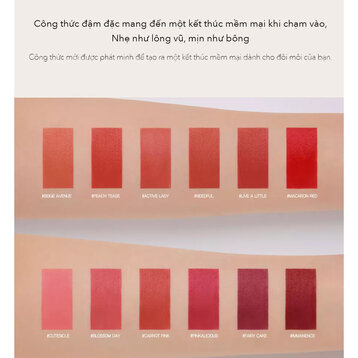 • Kết cấu mới - mịn nhẹ như mây: Cho bạn trải nghiệm "Walking in the cloud" - nhẹ như mây hồng. Chất son kem mềm mại sẽ khô lại nhưng không khô lì mà mềm mại trơn mịn. Chất son dễ dàng tán đều và bám chặt vào môi như lớp da thứ hai. Từ đó hạn chế việc lem son, vấy bẩn son và duy trì hiệu ứng che mờ rãnh môi, vân môi. Cho bạn đôi môi như mây như mơ.