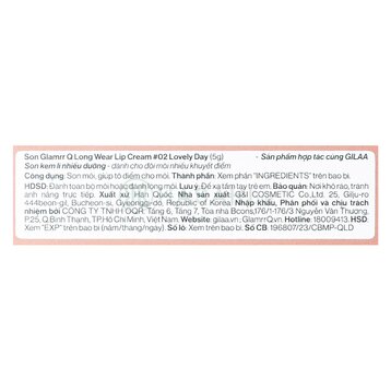 Son Kem Lì Glamrr Q Long Wear Lip Cream 5g là sản phẩm son kem lì đến từ thương hiệu mỹ phẩm Glamrr Q của Hàn Quốc, với bảng màu thời thượng, hợp mọi tông da cùng thành phần nhiều dưỡng, giúp giảm thâm khô và làm sáng hồng môi. Sản phẩm chứa công thức đặc biệt an toàn, lành tính cho làn da nhạy cảm.