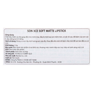 Thành phần sản phẩm 1. 3CE Soft Matte Lipstick #Orange Breeze Dimethicone, Isoamyl Laurate, Diphenyl Dimethicone-Vinyl Diphenyl Dimethicone-Silsesquioxane Crosspolymer, Polyglyceryl 2 Triisostearate, Vinyl Dimethicone-Methicone Silsesquioxane Crosspolymer, Polyethylene, Iron Oxides (CI 77491), Isoeicosane, Bis-Diglyceryl Polyacyladipate-2, Diisostearyl Malate, Hydrogenated Polyisobutene, Silica, Titanium Dioxide (CI 77891), Euphorbia Cerifera (Candelilla) Wax, Diglyceryl Sebacate/Isopalmitate, Dimethicone Crosspolymer, Synthetic Wax, Iron Oxides (CI 77492), Phytosteryl Macadamiate , Copernicia Cerifera (Carnauba) Wax, Sorbitan Isostearate, Caprylic/Capric Triglyceride, Polyhydroxystearic Acid, Ethylhexyl Hydroxystearate , Triethoxycaprylylsilane, Ethylhexyl Palmitate, Isopropyl Myristate, Isostearic Acid, Lecithin, Stearalkonium Hectorite, Polyglyceryl-3 Polyricinoleate , Polyglyceryl-2 Diisostearate, Propylene Carbonate, Pentaerythrityl Tetra-di-t-butyl Hydroxyhydrocinnamate, Yellow 5 Lake (CI 19140), Iron Oxides (CI 77499), Red 7 (CI 15850) 2. 3CE Soft Matte Lipstick #Way Back Dimethicone, Isoamyl Laurate, Diisostearyl Malate, Diphenyl Dimethicone-Vinyl Diphenyl Dimethicone-Silsesquioxane Crosspolymer, Titanium Dioxide (CI 77891), Vinyl Dimethicone-Methicone Silsesquioxane Crosspolymer, Polyethylene, Bis-Diglyceryl Polyacyladipate-2, Isoeicosane, Hydrogenated Polyisobutene, Silica, Polyglyceryl 2 Triisostearate, Euphorbia Cerifera (Candelilla) Wax, Diglyceryl Sebacate/Isopalmitate, Iron Oxides (CI 77491), Dimethicone Crosspolymer, Synthetic Wax, Phytosteryl Macadamiate , Caprylic/Capric Triglyceride, Copernicia Cerifera (Carnauba) Wax, Sorbitan Isostearate, Ethylhexyl Hydroxystearate , Polyhydroxystearic Acid, Stearalkonium Hectorite, Triethoxycaprylylsilane, Ethylhexyl Palmitate, Isopropyl Myristate, Isostearic Acid, Lecithin, Polyglyceryl-2 Diisostearate, Polyglyceryl-3 Polyricinoleate , Propylene Carbonate, Pentaerythrityl Tetra-di-t-butyl Hydroxyhydrocinnamate, Iron Oxides (CI 77492), Red 7 (CI 15850), Blue 1 Lake (CI 42090), Iron Oxides (CI 77499) 3. 3CE Soft Matte Lipstick #Chill Move Dimethicone, Isoamyl Laurate, Diphenyl Dimethicone-Vinyl Diphenyl Dimethicone-Silsesquioxane Crosspolymer, Vinyl Dimethicone-Methicone Silsesquioxane Crosspolymer, Polyglyceryl 2 Triisostearate, Polyethylene, Isoeicosane, Diisostearyl Malate, Bis-Diglyceryl Polyacyladipate-2, Titanium Dioxide (CI 77891), Hydrogenated Polyisobutene, Silica, Iron Oxides (CI 77491), Euphorbia Cerifera (Candelilla) Wax, Diglyceryl Sebacate/Isopalmitate, Dimethicone Crosspolymer, Synthetic Wax, Phytosteryl Macadamiate , Red 33 Lake (CI 17200), Ethylhexyl Hydroxystearate , Copernicia Cerifera (Carnauba) Wax, Sorbitan Isostearate, Caprylic/Capric Triglyceride, Polyhydroxystearic Acid, Polyglyceryl-2 Diisostearate, Ethylhexyl Palmitate, Isopropyl Myristate, Isostearic Acid, Lecithin, Triethoxycaprylylsilane, Stearalkonium Hectorite, Polyglyceryl-3 Polyricinoleate , Propylene Carbonate, Pentaerythrityl Tetra-di-t-butyl Hydroxyhydrocinnamate, Iron Oxides (CI 77492), Red 7 (CI 15850), Blue 1 Lake (CI 42090) 4. 3CE Soft Matte Lipstick #Hazy Rose Dimethicone, Isoamyl Laurate, Diphenyl Dimethicone-Vinyl Diphenyl Dimethicone-Silsesquioxane Crosspolymer, Vinyl Dimethicone-Methicone Silsesquioxane Crosspolymer, Diisostearyl Malate, Polyethylene, Titanium Dioxide (CI 77891), Bis-Diglyceryl Polyacyladipate-2, Isoeicosane, Hydrogenated Polyisobutene, Silica, Polyglyceryl 2 Triisostearate, Euphorbia Cerifera (Candelilla) Wax, Diglyceryl Sebacate/Isopalmitate, Iron Oxides (CI 77491), Dimethicone Crosspolymer, Synthetic Wax, Caprylic/Capric Triglyceride, Ethylhexyl Hydroxystearate , Phytosteryl Macadamiate , Copernicia Cerifera (Carnauba) Wax, Sorbitan Isostearate, Polyhydroxystearic Acid, Polyglyceryl-2 Diisostearate, Stearalkonium Hectorite, Ethylhexyl Palmitate, Isopropyl Myristate, Isostearic Acid, Lecithin, Triethoxycaprylylsilane, Polyglyceryl-3 Polyricinoleate , Propylene Carbonate, Pentaerythrityl Tetra-di-t-butyl Hydroxyhydrocinnamate, Red 7 (CI 15850), Iron Oxides (CI 77492), Red 6 (CI 15850), Blue 1 Lake (CI 42090) 5. 3CE Soft Matte Lipstick #Soft Mellow Dimethicone, Isoamyl Laurate, Diphenyl Dimethicone-Vinyl Diphenyl Dimethicone-Silsesquioxane Crosspolymer, Vinyl Dimethicone-Methicone Silsesquioxane Crosspolymer, Diisostearyl Malate, Polyglyceryl 2 Triisostearate, Polyethylene, Titanium Dioxide (CI 77891), Isoeicosane, Bis-Diglyceryl Polyacyladipate-2, Hydrogenated Polyisobutene, Silica, Euphorbia Cerifera (Candelilla) Wax, Diglyceryl Sebacate/Isopalmitate, Iron Oxides (CI 77492), Dimethicone Crosspolymer, Synthetic Wax, Iron Oxides (CI 77491), Phytosteryl Macadamiate , Copernicia Cerifera (Carnauba) Wax, Sorbitan Isostearate, Caprylic/Capric Triglyceride, Polyhydroxystearic Acid, Triethoxycaprylylsilane, Ethylhexyl Palmitate, Isopropyl Myristate, Isostearic Acid, Lecithin, Stearalkonium Hectorite, Ethylhexyl Hydroxystearate , Polyglyceryl-3 Polyricinoleate , Polyglyceryl-2 Diisostearate, Propylene Carbonate, Pentaerythrityl Tetra-di-t-butyl Hydroxyhydrocinnamate, Yellow 6 Lake (CI 15985), Red 6 (CI 15850), Iron Oxides (CI 77499), Red 7 (CI 15850) 6. 3CE Soft Matte Lipstick #Warmish Move Dimethicone, Isoamyl Laurate, Diphenyl Dimethicone-Vinyl Diphenyl Dimethicone-Silsesquioxane Crosspolymer, Vinyl Dimethicone-Methicone Silsesquioxane Crosspolymer, Polyethylene, Diisostearyl Malate, Polyglyceryl 2 Triisostearate, Isoeicosane, Titanium Dioxide (CI 77891), Bis-Diglyceryl Polyacyladipate-2, Silica, Hydrogenated Polyisobutene, Euphorbia Cerifera (Candelilla) Wax, Diglyceryl Sebacate/Isopalmitate, Ethylhexyl Hydroxystearate , Iron Oxides (CI 77492), Dimethicone Crosspolymer, Synthetic Wax, Iron Oxides (CI 77491), Caprylic/Capric Triglyceride, Copernicia Cerifera (Carnauba) Wax, Phytosteryl Macadamiate , Sorbitan Isostearate, Polyhydroxystearic Acid, Triethoxycaprylylsilane, Ethylhexyl Palmitate, Isopropyl Myrista