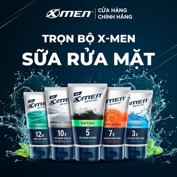 Thành phần sản phẩm 1. Sữa Rửa Mặt X-Men Go Detox Loại Bỏ 5 Tác Nhân Ô Nhiễm 100g Thành phần chính: Than tre hoạt tính:giúp loại bỏ hiệu quả 5 tác nhân ô nhiễm môi trường – bụi, khói xe, bã nhờm, vi khuẩn & mồ hôi – là nguyên nhân gây ra mụn, đồng thời thành phần thiên nhiên an toàn, không gây kích ứng da. Hỗn hợp chiết xuất từ thiên nhiên Clair-Blanche: giúp làm sáng da hiệu quả. 2. Sữa Rửa Mặt X-Men Go Refresh 3x* Sức Mạnh Mát Lạnh 100g Thành phần chính: 3 loại bạc hà (Wild mint, Pepper mint, Menthol Crystal): mang lại cảm giác cực mát lạnh và sảng khoái khi sử dụng. 3. Sữa Rửa Mặt X-Men Anti-Acne 7x* Sạch Da Ngừa Mụn 100g Thành phần chính: Muối khoáng Himalaya:giúp làm sạch da và ngừa mụn hiệu quả. Hợp chất tiên tiến OCS: kháng khuẩn, ngừa mụn.