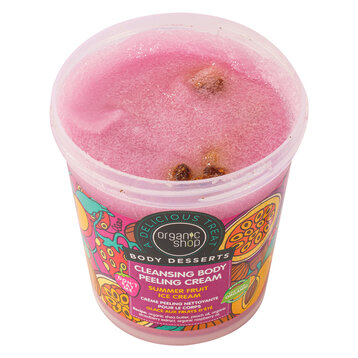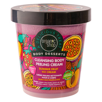 Tẩy Tế Bào Chết Toàn Thân Organic Shop Summer Fruit Ice Cream có khả năng làm sạch sâu lỗ chân lông và dưỡng da trở nên mịn màng và mềm mượt. Sản phẩm chứa chiết xuất bơ hạt mỡ hữu cơ và dầu đào giúp dưỡng ẩm cho làn da, trong khi chiết xuất dâu tây hữu cơ và dầu quả mâm xôi hữu cơ có tác dụng nuôi dưỡng và làm mềm da.